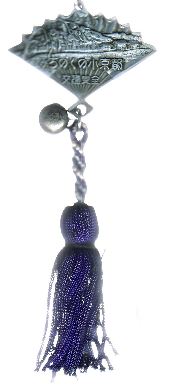 本品は、上段飾りに長物の日本刀、下段飾りに組紐という珍しい構成。扇形のメダルには、角館を代表する青柳家の屋敷が描かれる。